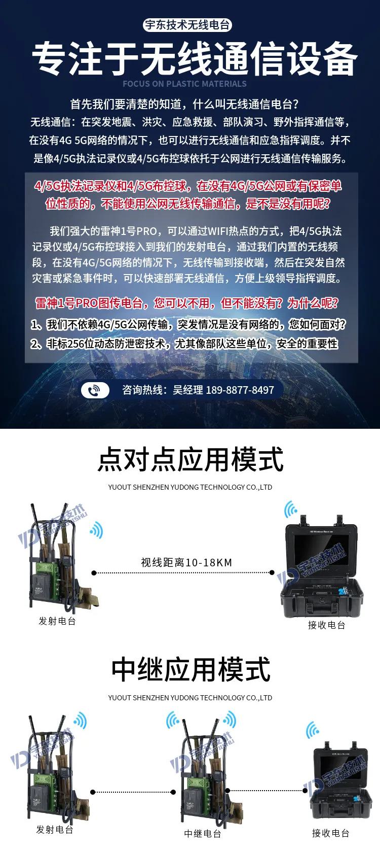 宇東技術(shù)雷神1號(hào)PRO背負(fù)式高清單兵無(wú)線圖傳電臺(tái),是公司針對(duì)應(yīng)急救援指揮、部隊(duì)拉練演習(xí)、公安、反恐作戰(zhàn)、消防救援、邊防執(zhí)勤、海警海關(guān)巡檢、森林消防等,在突發(fā)重大事件,斷網(wǎng)斷電,通信中斷的情況下,現(xiàn)場(chǎng)工作人員通過(guò)宇東雷神1號(hào)PRO單兵無(wú)線圖傳電臺(tái),可以和指揮部雙向語(yǔ)音通話對(duì)講,把現(xiàn)場(chǎng)采集的數(shù)據(jù)實(shí)時(shí)無(wú)線傳輸?shù)街笓]車(chē)/臨時(shí)指揮部大屏幕,讓指揮部領(lǐng)導(dǎo)對(duì)現(xiàn)場(chǎng)情況一目了然,節(jié)省了到達(dá)現(xiàn)場(chǎng)的時(shí)間,可快速做緊急指揮調(diào)度,最大限度的減少突發(fā)事件帶來(lái)的各種損失。